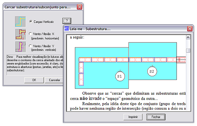 • Comando para atualização das representações de desenhos: Ao se alterar alguma(s) entidade(s) para a planta (desenhos e/ou legendas para bloco/tijolo, graute, portas, janelas, identificadores, etc), através deste comando (“Geral --> Atualizar entidades (desenhos)”), todo o desenho fica com as novas representações e/ou legendas. • Ajuda rápida: Para os comandos principais do processo de modelagem de um projeto em Alvenaria, através do CAD/Alvest (definição das “cercas das paredes”, inserção de linhas de cargas e (por fim) a definição das “subestruturas”), foram incorporados botões de ajuda com dicas e também com apontamentos de erros comuns.