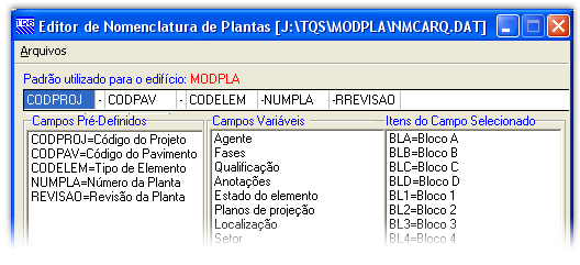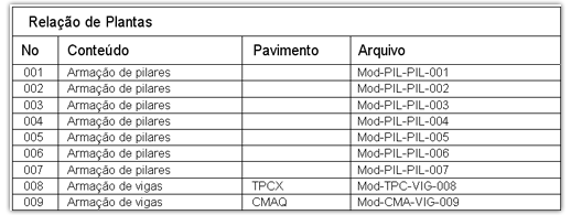 Uma vez definida uma nomenclatura, todas as plantas são geradas com a mesma regra. Pode-se também armazenar nomenclaturas diferentes para diferentes clientes, e armazená-las em uma biblioteca, para uso em qualquer projeto. Por exemplo, poderíamos gerar nomes de plantas como: MOD-4PA-VIG-010.CPL MOD Prefixo do edifício MODPLA Comentários de revisão por desenho são definidos na saída dos editores gráficos, aparecendo na seleção de desenhos e indo para o banco de dados de emissão de plantas: