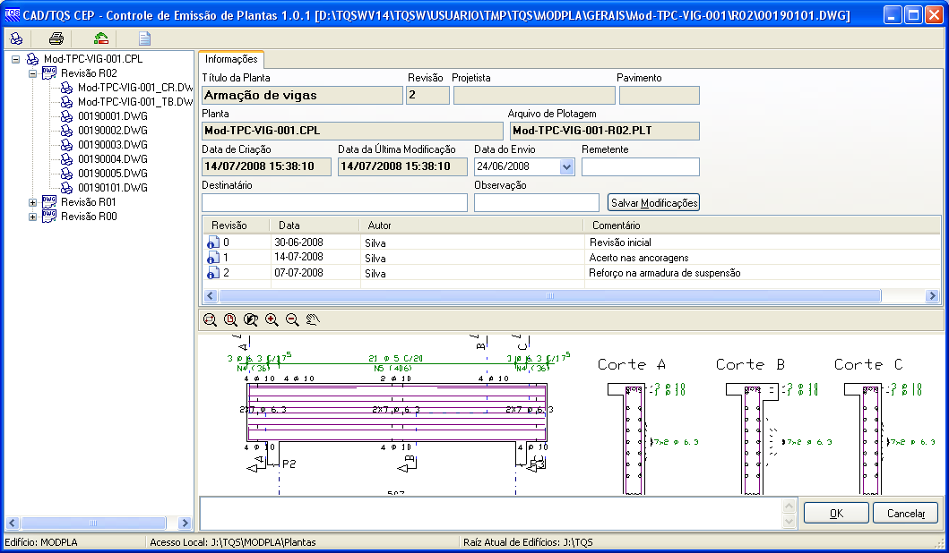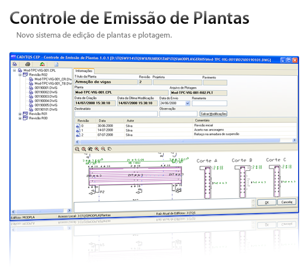 Os comentários das revisões podem entrar automaticamente no carimbo, ou um novo desenho gerado automaticamente com esses comentários pode ser inserido na planta, após a extração da tabela de ferros. Agora, um novo desenho gerado durante o resumo estrutural, contém todas as plantas emitidas para o cliente e as respectivas listas de consumo de materiais: