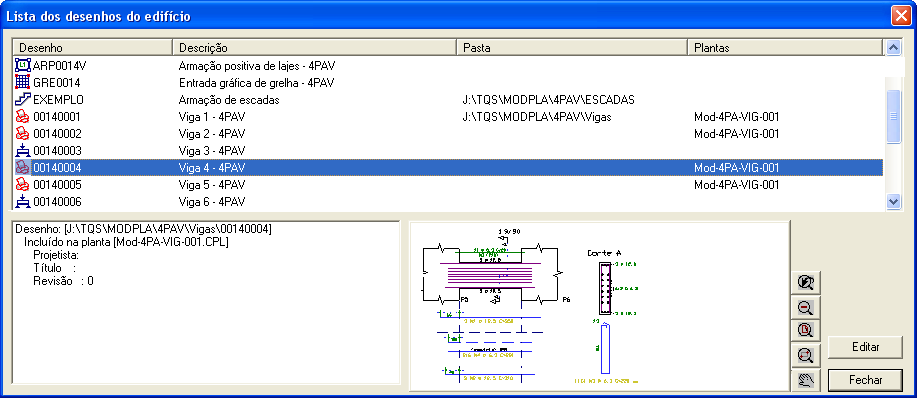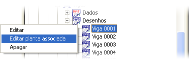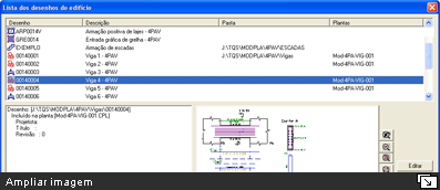 Temos também um modo diferente de visualizar os desenhos, em uma única lista com todos os desenhos do edifício, suas pastas e plantas relacionadas. Esta lista também pode ser chamada do gerenciador, e usada para editar diretamente os desenhos com duplo-clique. A planta onde um desenho foi inserido pode ser editada selecionando-se o desenho e acionando um novo comando do gerenciador, na barra de ferramentas ou menu de contexto: