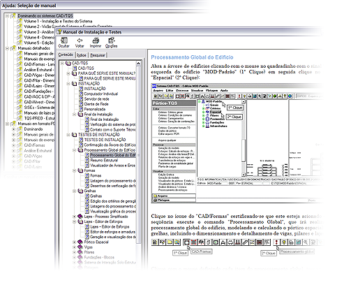 Todos os manuais do sistema CAD/TQS® foram reformulados e modernizados. A reestruturação do conteúdo, de modo a apresentar apenas os conceitos e critérios fundamentais do programa, possibilitou uma diminuição considerável do total de páginas impressas sem perda de qualidade de informação. Além disso, uma nova diagramação e estrutura dos textos permitem uma leitura mais fácil e natural do conteúdo. Os novos manuais impressos apresentam ao leitor um caminho que explora a seqüência natural de um projeto estrutural completo demonstrando, através de exemplos, desde o lançamento até a plotagem das plantas de um projeto, passando pela análise estrutural, dimensionamento de elementos e edição de armaduras. Para complementar as informações presentes nestes manuais impressos, temos ainda os “Manuais On-line”, no item “Ajuda” do sistema, que contêm explicações detalhadas sobre todos os itens (critérios, modelos, etc) presentes no CAD/TQS®, servindo de uma importante fonte de consulta. Nova Documentação OnlineO sistema de ajuda presente no CAD/TQS foi totalmente reformulado e ampliado. Agora, além do help em formato HTML que possibilita uma busca completa por toda documentação, estão também disponíveis todos os manuais em formato PDF para impressão.