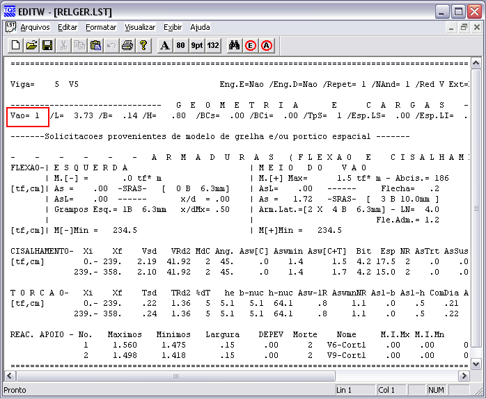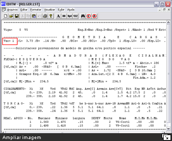 Melhorias em relatóriosTodos os relatórios do sistema de vigas foram modificados para tratar a numeração de vãos e balanços sempre começando pelo número um. Foi retirada do relatório geral de vigas a impressão de cargas para o modelo estrutural IV. Foi também indicada a capacidade de adaptação plástica à torção no vão. Aumento do campo para título dos apoiosOs apoios agora são identificados por títulos maiores que 4 caracteres. Este tratamento é válido tanto para os títulos dos pilares como para os títulos das vigas.