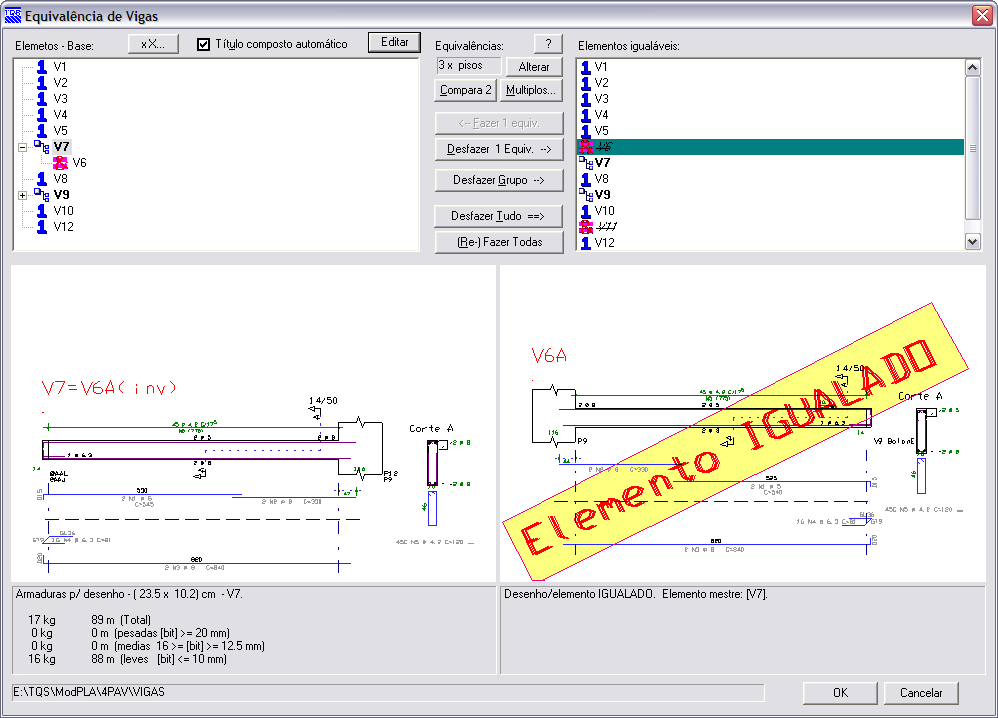 Equivalência de desenhos de vigasAtravés deste novo comando, o usuário pode facilmente controlar o processo de “igualar” os desenhos de vigas. Este processo verifica, antes da equivalência, a geometria (vãos, apoios) e também as taxas de armadura (para que a equivalência seja sempre pelo elemento com mais armaduras). Vigas inclinadasO sistema agora detalha e desenha automaticamente as vigas inclinadas, com um ou mais vãos.