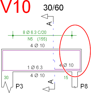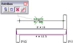 Faixa de estribos em balanços muito curtosAtravés de critério de projeto, o usuário pode definir o comprimento mínimo para uma faixa de estribos. No caso de balanços muito curtos, as faixas deixam automaticamente de serem criadas.