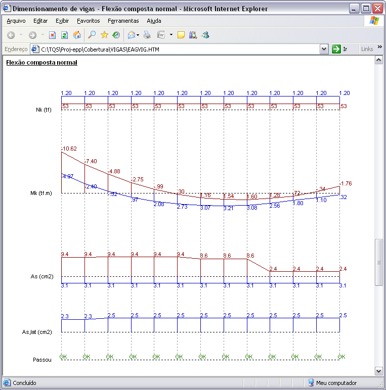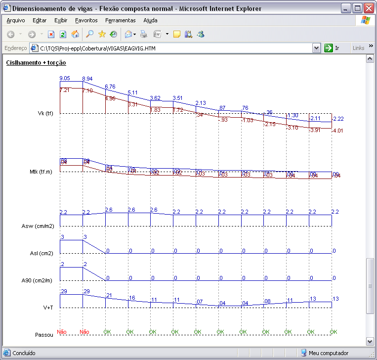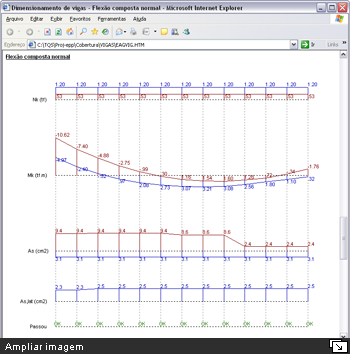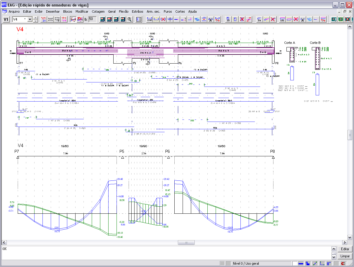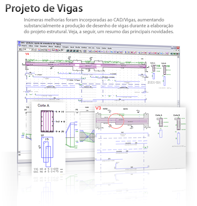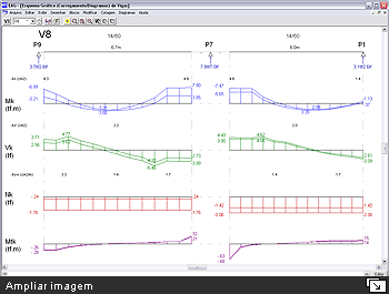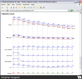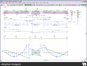 Undo e Redo no Editor Rápido de ArmadurasDurante a edição de dados das armações de uma viga, o usuário pode desfazer e/ou refazer qualquer alteração, sem limitações. Comando de verificação de vigasO comando de verificação à flexão composta normal existente dentro do editor rápido de armaduras do CAD/Vigas foi ampliado e melhorado. Ao invés de resultados em tabelas, todas as informações por vão da viga são apresentadas graficamente, conforme mostra a figura a seguir. Além da verificação das solicitações normais, passam a ser também considerados os efeitos de cisalhamento e torção de forma combinada. Diagrama de solicitações em vigasO visualizador de diagramas de solicitações em vigas foi amplamente remodelado e melhorado. Além do esquema estrutural da viga, que inclui a representação dos apoios, trechos rígidos e vãos teóricos, os diagramas de solicitações (N, V, M, Mt) são apresentados em cores, facilitando a interpretação dos resultados. Diversos parâmetros que controlam a visualização dos diagramas foram adicionados, tais como: tamanho dos textos, impressão de valores intermediários, enquadramento automático do desenho na janela, etc. Essa nova representação dos diagramas de solicitações também foi disponibilizada no editor rápido de armaduras, podendo auxiliar na concatenação dos esforços atuantes na viga com o dimensionamento e detalhamento de suas armaduras. Cortes de seção em vigasO desenho dos cortes de seções transversais em vigas foi melhorado. O resumo e o posicionamento das armaduras são representados com mais precisão. Ao longo da viga, todos os cortes são ordenados automaticamente.