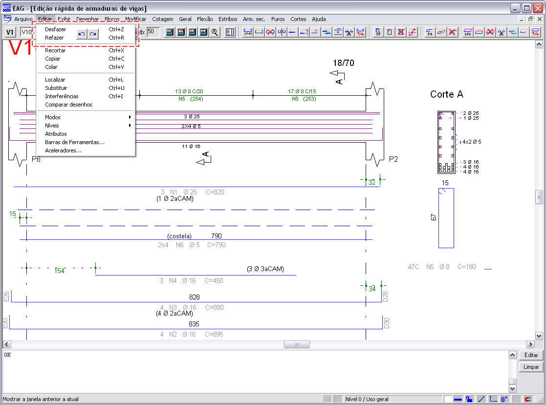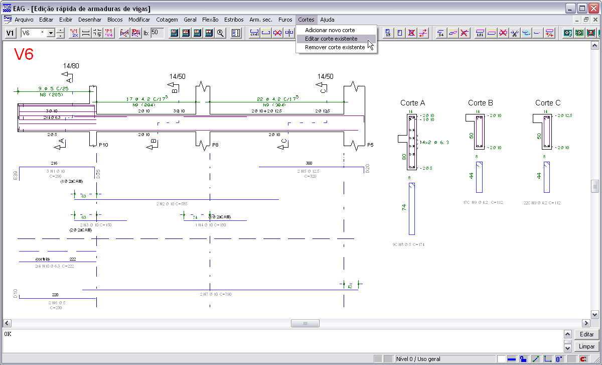 Dentro do editor rápido de armaduras, foram criados comandos específicos para adicionar, remover ou editar cortes em uma viga. Viga com balanço único à direitaVigas com balanço único à direita passaram a ser desenhadas na posição correta.