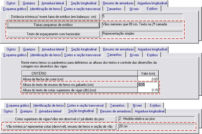 Espaçamento máximo de estribosQuando a viga possui solicitações de torção, o espaçamento máximo de estribos da viga pode considerar os efeitos combinados de força cortante e torção (VSd/VRd2 + TSd/TRd2). Critério específico para tal finalidade está disponível. Seleção de bitolas de flexãoSe os possíveis alojamentos fornecidos no arquivo de critérios não forem suficientes para o detalhamento do As calculado, a maior bitola presente nos alojamentos é a adotada. Anteriormente era adotada a 9ª. bitola da tabela de flexão. Cobrimento superior diferenciadoÉ possível o fornecimento de um valor para o cobrimento superior da viga, diferente do cobrimento normal das armaduras. O sistema de vigas irá calcular as armaduras longitudinais e transversais considerando este novo cobrimento. Estribos são desenhados menores que os convencionais.