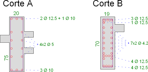 No editor rápido de armaduras, foi adicionado um comando que permite mover a posição do “dente de concreto”. Estribos de 6 Ramos – Detalhamento automáticoO detalhamento de estribos com até 6 ramos é agora possível no sistema de vigas. Critérios de projeto foram introduzidos na seleção automática de 2, 4 ou 6 ramos. Exemplo: